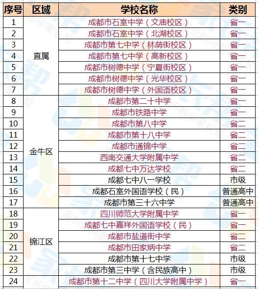 通过上面的表格可以看出,中心城区中,锦江区和金牛区的省一级示范校数量均为两所,其他区域基本为一所。