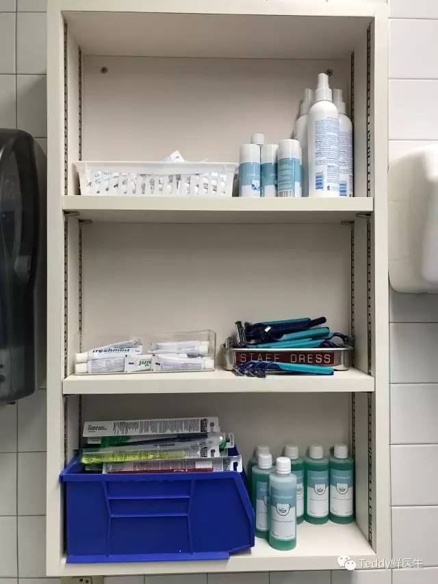 更衣室为医生准备了洗浴用品,有浴巾、一次性牙膏、牙刷、须刨、漱口水、发胶等等。做完一天的手术之后洗个热水澡,消除疲劳,再打扮的漂漂亮亮的出去。
