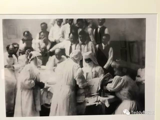 梅奥早期拍摄的术中照片,右下角的即是麻醉护士。医学史上最开始是没有麻醉医生的,外科医生自己手术、自己打麻醉。后来外科医生为了集中精神做手术,于是培训护士帮忙做麻醉及照看病人,只是后来麻醉要求越来越高的时候,才出现了麻醉医生。