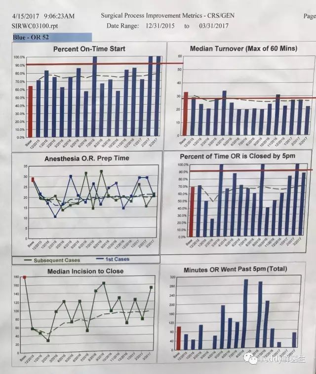 该表统计了从2015.12.31–2017.03.31日手术按时开始的比例、麻醉准备时间、手术从开腹到关腹的中位时间、手术接台时间、手术间在5点钟关闭的比例,还有手术时间超过下午5点的平均分钟数。如果发现哪个环节出了问题,会及时改进,提高工作效率。
