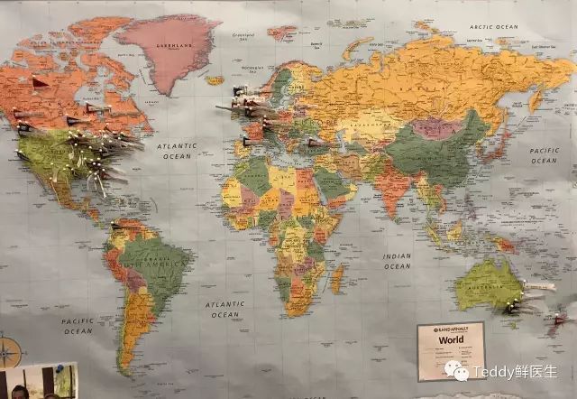 在办公室墙上拍到的一张地图,上面插的每一个小旗子代表在梅奥结直肠外科培训过的一个Fellow