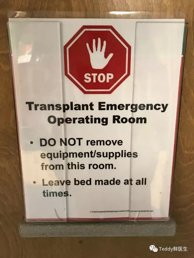 器官移植手术间门口的标识:移植急诊手术间,勿移动此手术室内设备和物品,保持手术床常备状态