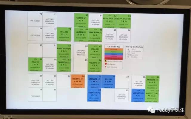 手术室随处可见的大屏幕,显示每间手术室的工作状态,包括手术名称,主刀医生,手术进行到什么程度了,比如刚开始切开、进行中、关腹、病人准备移走、抢救等,由每间手术室的巡回护士负责更新状态。