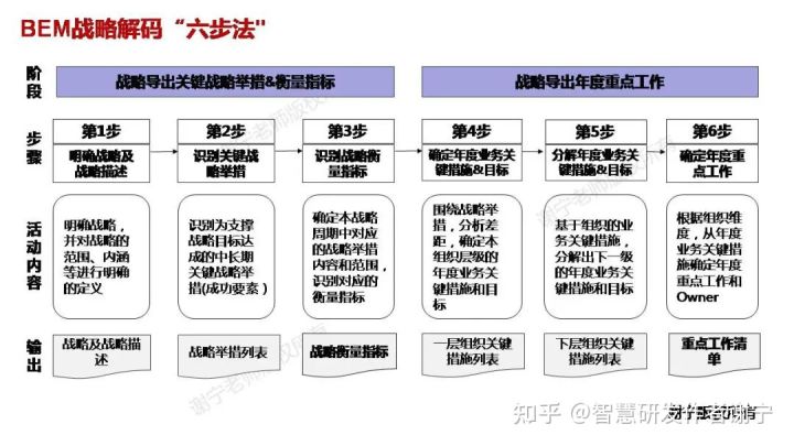 如前所述,BEM业务执行力模型方法论主要有两个阶段:战略导出CSF&KPI、战略解码并执行闭环。两个阶段共有六个步骤,简称为BEM“六步法”,如图所示。