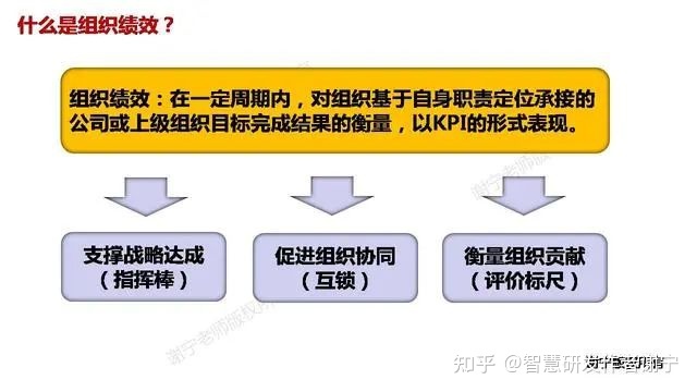 组织绩效的主要作用是战略牵引(指挥棒)、强化组织协同、衡量组织贡献和强化激励。