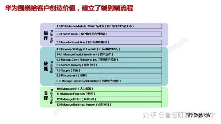 华为的运作流程是沿着业务流的概念构建的。华为认为“为客户服务是华为存在的唯一理由”。华为公司的运作流程(即为客户进行价值创造的流程),其实对应着公司三件大事:
