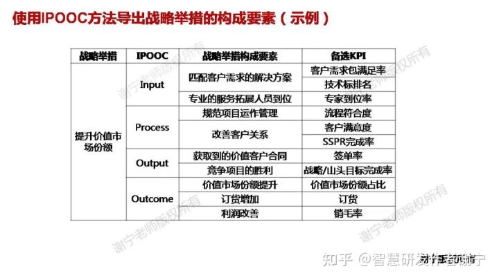 下面通过一个例子来说明。针对战略举措“提升价值市场份额”,使用IPOOC方法导出其构成要素,并针对构成要素设计备选KPI,如表所示。