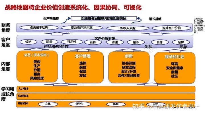 谢宁老师认为,战略地图给我们带来一个全面的、系统化和可视化的视角。它可以将我们企业战略内容完整呈现,而且让团队围绕着它进行系统地、端到端地研讨,达到“一张地图胜千言万语”的效果。在企业中,有不同的部门、不同环节的人员,各自对战略的关注点不同。比如市场人员可能偏向客户、市场层面;对供应链以及研发等人员更侧重于内部运作和学习成长等等方面。用战略地图可以帮助员工从全局﹑端到端角度来思考公司战略,并思考战略的承接以及横向的跨部门协同。