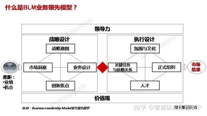 以上是对BLM模型的差距分析、领导力、价值观、“战略设计”和“执行设计”,共十一个模块内容的简要介绍。