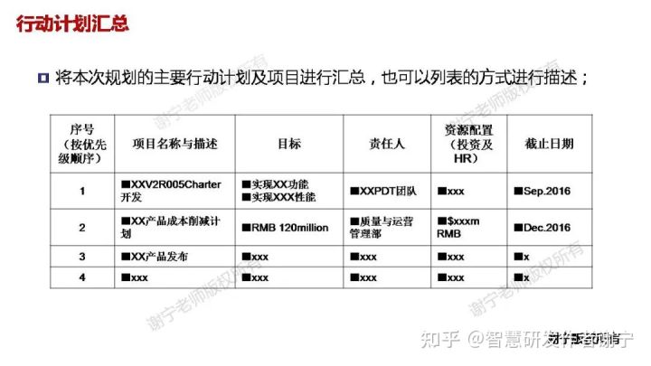 将重点工作的主要行动方案和计划进行汇总,也可以列表的方式进行描述,如表所示。