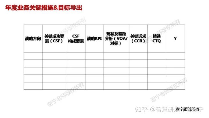 年度业务关键措施&目标导出,又称CTQ-Y导出。其中,CTQ是Critical-To-Quality 品质关键点的英文缩写,即从客户与经营角度,对Process(过程)或Product(输出)提出的关键业务特性,是为了支持战略达成当年业务所需改进的关键点。