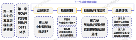 本书共有八章,笔者旨在深入解剖和分析华为战略历程、战略管理特点及基本原则,限度呈现华为战略管理各主要阶段的内容、工具、方法及管理细节。华为的DSTE流程框架有四大阶段:战略制定、战略解码、战略执行与监控及战略评估。本书的基本框架内容如下图所示。
