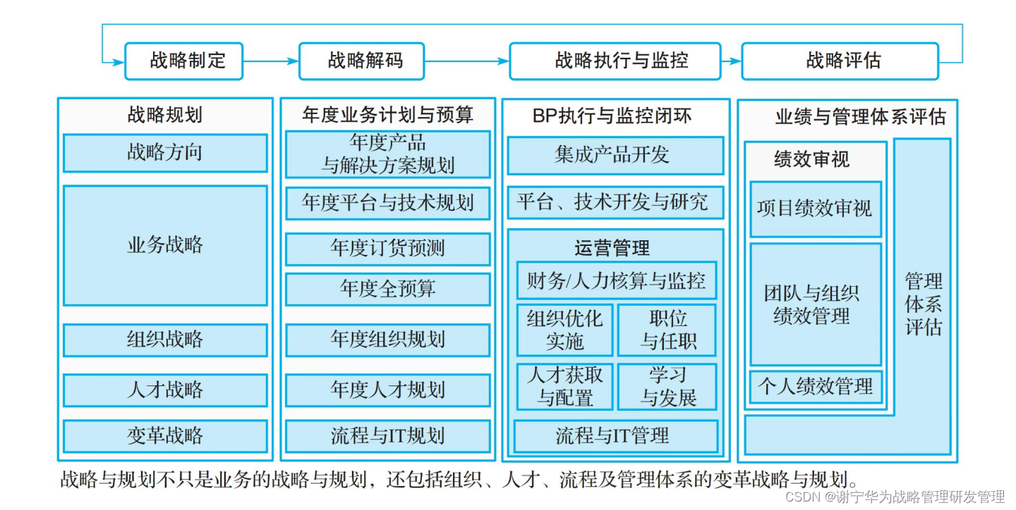 华为认为,战略规划是实现企业愿景使命的谋划,是基于全局和未来作出有限资源下的取舍,是不断适配客户变化去寻找自身的定位与抉择。战略管理是指确定愿景和使命后,通过战略洞察识别发现和聚焦战略机会,制定战略规划(SP)和年度业务计划(BP),并配置资源推进落地执行,管理执行和监控目标达成的动态管理过程。战略管理不是静态的,而是主动洞察市场变化和利用自身优势,进行周而复始、持续提升管理水平的动态管理过程。