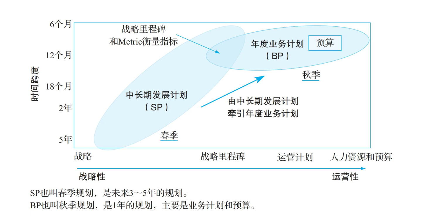 公司要求各部门在秋季开展BP的制定工作,并在次年3月底前通过公司审核。各部门的BP包含过去一年部门的总体运营情况、未来一年部门的目标、财务预算、产品策略、区域销售策略、客户拓展策略、服务策略、品牌策略、交付策略等内容,是跨度为一年的作战方案。