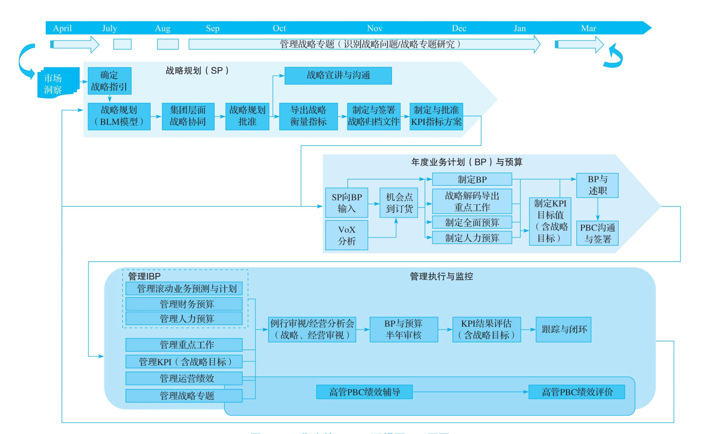 管理执行与监控的主要内容有管理IBP(Integrated Business Plan,集成经营计划)、管理重点工作、管理KPI、管理运营绩效、管理战略专题等。