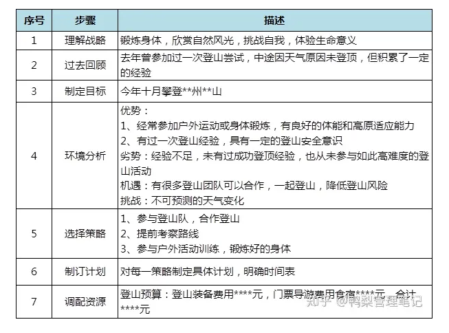 以上为部门计划制定七步法。我们以登山这一事件为例,示意七步计划法的细化流程及每一步骤的具体含义。