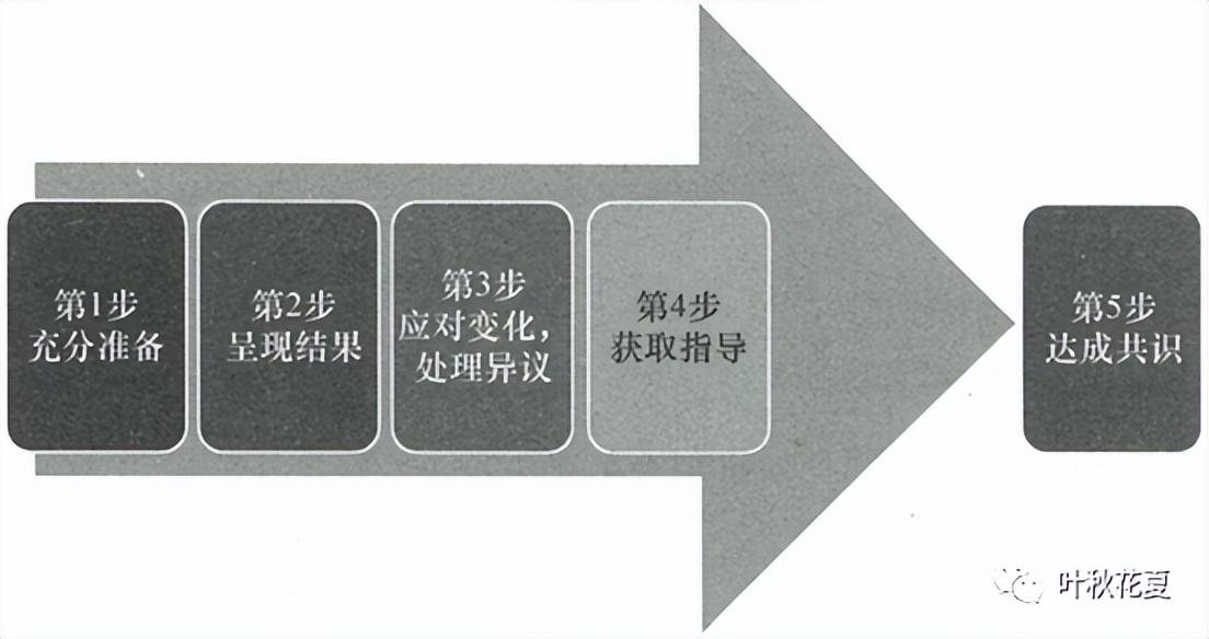 通常向上司汇报有5个步骤:充分准备(包括心理、方案、材料的准备);呈现结果(简洁的话先说结论);应对变化、处理异议(环境、情绪、事态);获取指导(包括方法、思想、理念的指导);达成共识(包括思路、目标、行为的共识)。