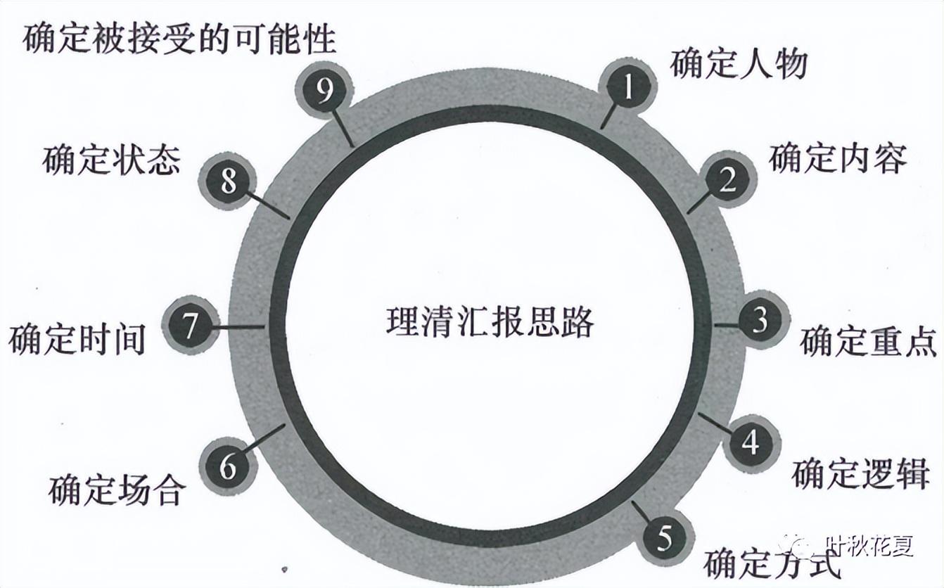 理清汇报思路,才能明确汇报的内容。通常可以通过以下9个简单的步骤理清自己的汇报思路:确定人物(汇报对象)、汇报内容、确定汇报重点、确定汇报逻辑(如时间、时间、空间逻辑)、确定方式(口头、电邮、PPT)、确定场合、确定时间、确定状态、确定被接受的可能性。