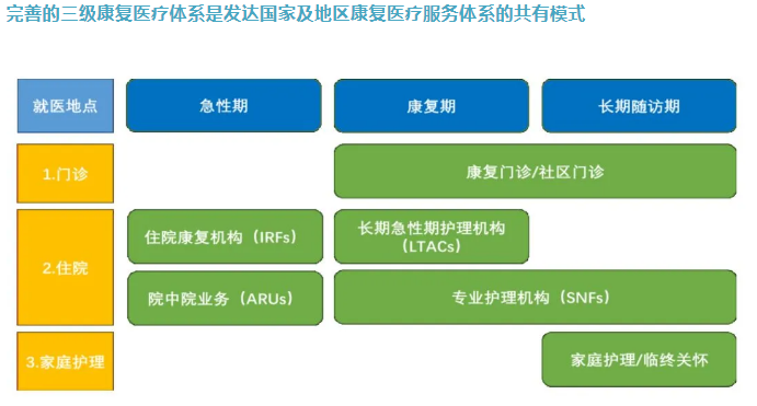 完善的三级康复医疗体系是发达国家及地区康复医疗服务体系的共有模式三级体系中的康复机构包括:住院康复机构(IRFs):仅限于预期在合理时间段内会有显著功能改善以及有可能重返社区环境的患者,既可是位于急性治疗医院内的独立区域,也可是一个独立机构。长期急性护理机构(LTACs):提供急性期后康复治疗的患者住院机构。专业护理机构(SNFs):为需要日常专业护理或康复服务的患者提供康复治疗。各类康复机构有明确的分工和康复界定,行业高度细分,根据病人情况对应到不同的康复机构,并有相应的医保准入要求,从而形成了机构间的明确分工,有效的缓解了急诊医院的病患压力。而国内现阶段还是只是简单划分为综合医院内康复医学科和康复专科医院。与细分的康复机构相对应的是流畅的分诊转诊途径。在积极的康复前置理念的引导下,美国的康复早期介入体现在急性期康复中的床边康复,在急性病医院而非在康复科实施,在早期就向患者提供中等强度的康复治疗,由康复医师会诊并根据病情开具康复治疗和相关处方。患者入院后,主治医生根据标准的独立功能量表评估(FIM)结果和患者自身可接受的程度进行康复治疗,此阶段患者病情稳定,能够耐受每天3小时、每周5天的康复训练;若能够承受每天介于1~3小时之间的康复训练,则转诊至亚急性康复病房、专业康复机构或长期照护机构。不需要住院康复治疗即可恢复的患者也可尽快转至家庭和社区机构。这种康复医疗模式的特点是各级康复机构对患者功能状态严格把控,保险支付政策细化完善,分诊、转诊顺畅。美国康复机构中专业/家庭护理机构占90%以上美国康复医疗机构数量众多,约三万家左右,近几年趋于稳定。美国康复机构中数量最多的是专业护理机构,有15000多家,占50%以上。由于家庭护理具有上门护理的便利性,其康复项目与专业护理机构提供的非设备康复项目相差无几,且受Medicare计划覆盖,这些因素都推动了近些年来美国家庭护理业务的快速增长,数量已经占到40%左右。设立在综合医院内的康复科和康复病床规模都比较小,平均床位24张;康复专科医院则相对大一些,床位可达一百多张。全部平均下来康复医院床位数为33张,住院周期为12.7天,Medicare平均给付20,153美元。从下表中对比医院的成本和Medicare给付,可以明显看出连锁式的康复专科医院盈利空间优于独立的康复专科医院,而康复专科医院的盈利空间更是远远大于那些设在综合医院中的康复病床。资料来源:南方医疗集团年报,另2018年1月,南方医疗集团已更名为Encompass Health
