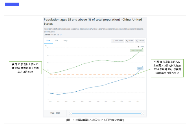 反观中国,达到该比例的时间是在2014年,也就是说,中美间,人口老龄化进程相差将近50年(65岁及以上老龄人口占全国总人口百分比的变化趋势的中美对比见图一,上方曲线代表美国,下方曲线代表中国,数据来源于世界银行,World Bank)。