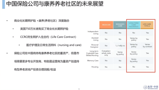 长期护理保险这个产品,当长者达到半失能的状态,或者护理的状态的时候,确实能够给他们提供一些保障,能够确保他们住到品质比较高一点的养老公寓或者护理院。但Life Care Contract相对而言,它其实已经在很多领域实现了长期照护险的保障内容,所以这就是为什么说在美国入住了ccrc,如果选择入住合约,基本上等于买了一份长照险。