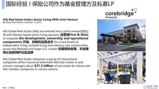 根据2015年的报道,AIG团队用自己管理的基金,包括自有资金,还有第三方的资金,跟养老运营开发商first man合作,来开发、持有以及运营新的自理公寓,半自理和认知症照护社区品牌。