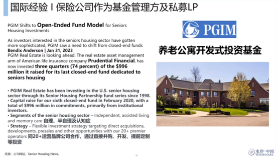 PGIM跟20多家运营品牌公司合作,帮助Prudentail在养老公寓领域的投资,实现它需要的投资回报或者价值,同时能满足Prudentail作为资产管理方投资人自有资金的回报,甚至能为它受委托管理的基金或者第三方投资人,带来可观的、稳定的、中长期的现金流投资回报。