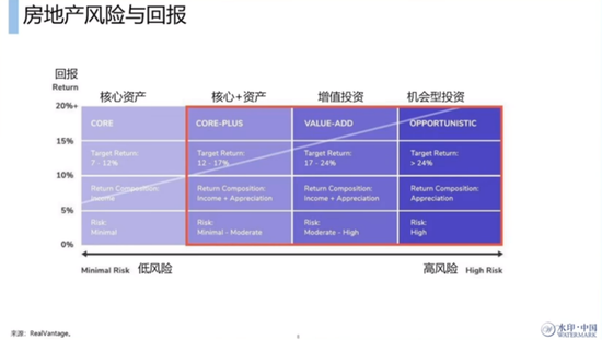 简而言之,针对核心资产,通常的年化的回报收益率预期在7~12%之间,核心+资产在12~17%的之间,增值投资是17~24%,机会性的投资在24%以上。当然针对不同的市场,不同的区域,不同的国家,其实投资回报可能有一些调整。