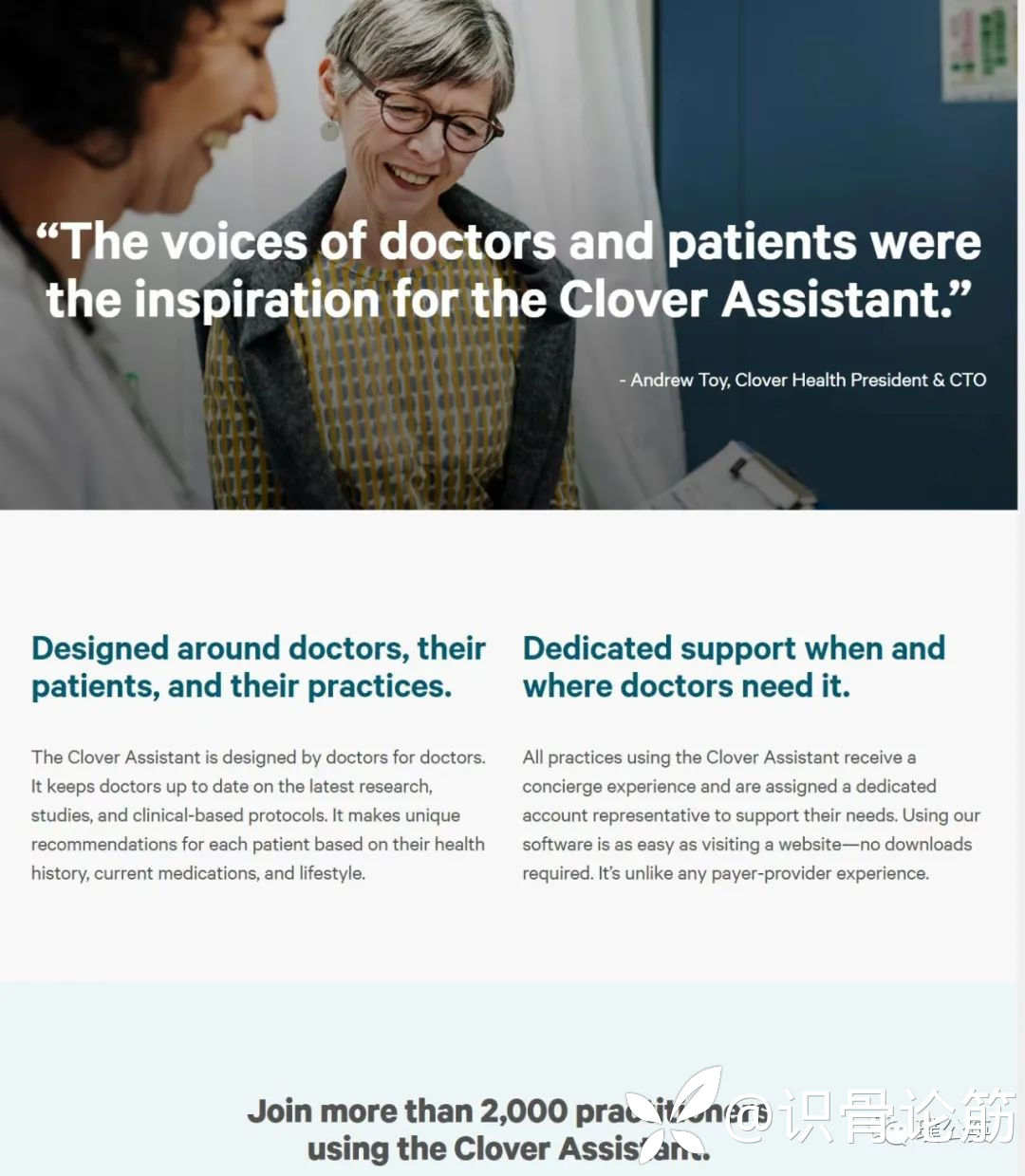 Clover Assistant是Clover Health的专属软件平台,其开发初衷是帮助医疗从业者提高对患者的照护能力。Clover Health认为:历史上,因资源和基础设施所限,美国所提倡的以价值为基础的照护(value-based care),其实仅局限在高级别(sophisticated)医师群体中。而给美国医保Medicare受益人(特别是高风险老人)提供医疗服务的,多是基层初级医师。有了Clover Assistant这个技术助手,Clover Health相信可以帮助所有医生(特别是初级保健医生),并从而可以让所有患者享受到以价值为基础的照护。