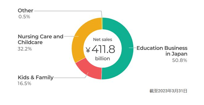 目前其业务覆盖从幼儿到老年的多个年龄阶段。主要包括日本国内教育业务(Education Business in Japan)、幼儿和家庭(Kids & Family)、养老护理和儿童保育(Nursing Care and Childcare)、贝利兹语言培训(Berlitz)、其他(Others)五个业务板块。