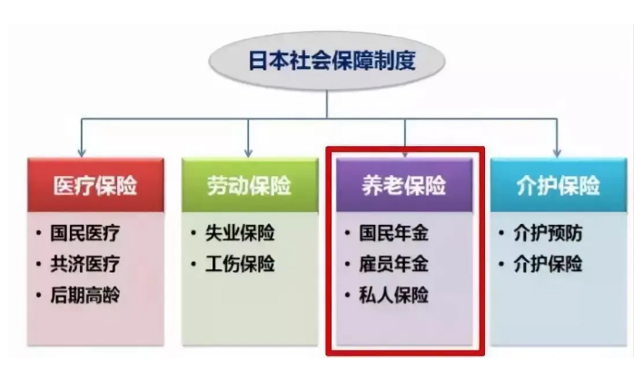 第一层:国民年金(又称基础年金),凡20岁以上60岁以下、在日本拥有居住权的所有居民,都必须参加国民年金保险。又分为养老年金、残障年金、寡妇年金、母子年金和遗孤年金5种。所有参加保险的公民都必须缴纳保险费,在缴纳一定年限的保险费后才能受领保险金。但对一些特殊对象,如无收入的老人、单亲家庭、残疾者、5人以下小工业者的被雇佣者等,则采用非缴费型福利年金制度,费用全部由国家负担。
