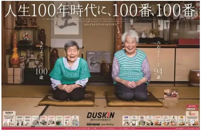 2018年,在Duskin成立55周年之际,“ぎんさん”的女儿也将年满百岁,企业顺势邀请百岁老人拍摄彩页广告,将两位老人作为“人生100年时代”的象征,传达企业“面向所有年龄段和不同生活方式的客户提供产品和服务”的经营理念。