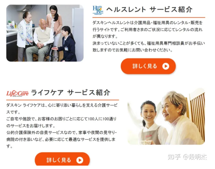 其中,以专业清洁服务业务享誉海内外市场的Duskin,自2000年起,以Duskin Life Care和Health Rent——老年家庭护理服务与老年家庭护理用品销售与租赁服务两大业务切入银发赛道。